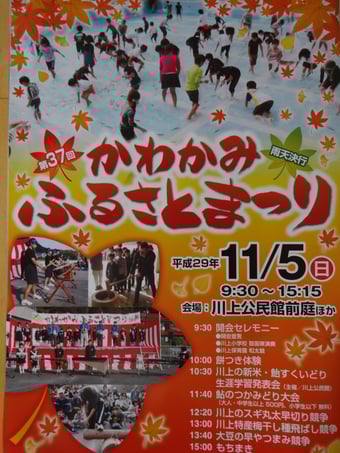 13日 10月 2017 お知らせ 「かわかみふるさとまつり」 日時:11月5日(日) 会場:川上公民館前庭ほかにて いろいろなイベントがたくさんあります。 ぜひおこしください。 tagPlaceholderカテゴリ: